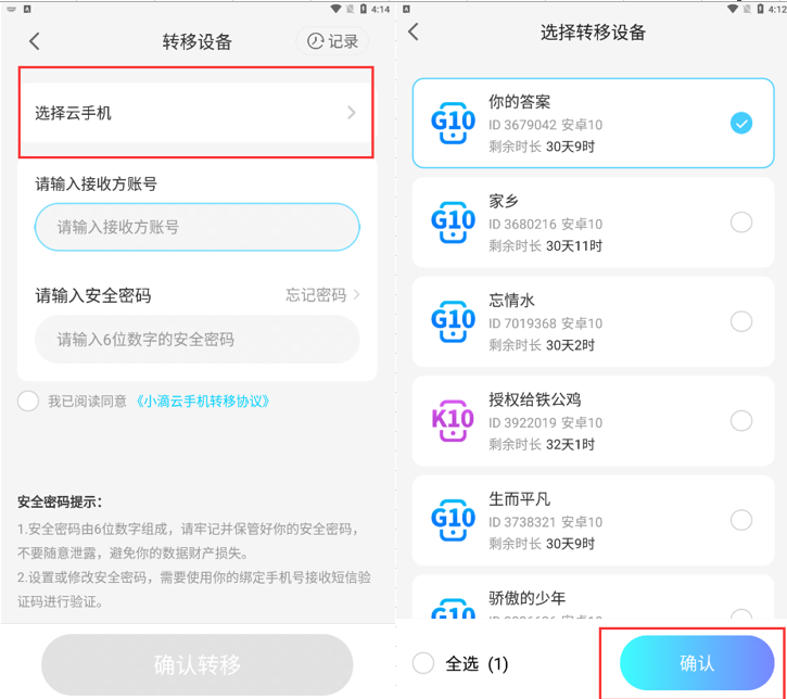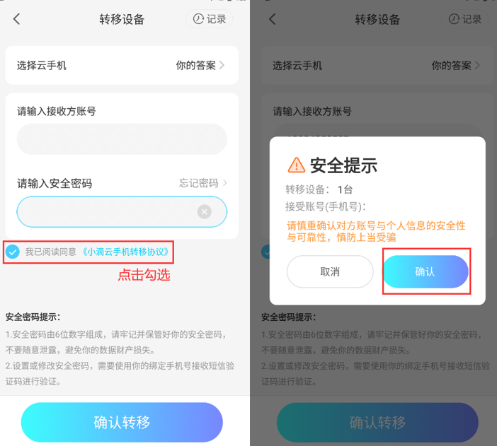3、选择需要接收设备的账号(可以是账号ID或者手机号码),再输入安全密码,点击勾选“我已阅读同意《小滴云手机转移协议》,点“确认转移”,转移时会有提示,点确认即可。