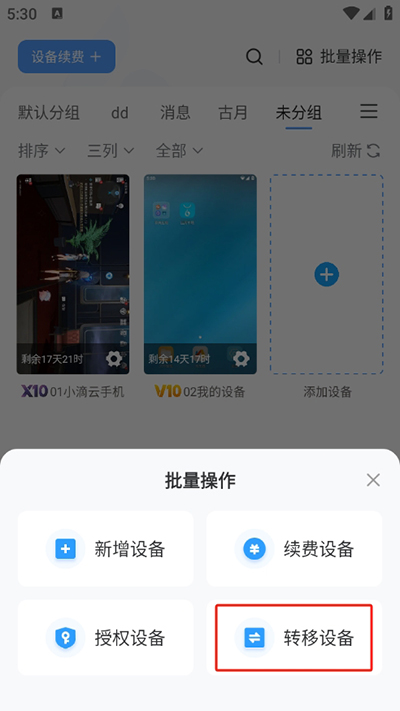 1、在云手机界面,点击左上角-批量操作,找到并点击转移设备;