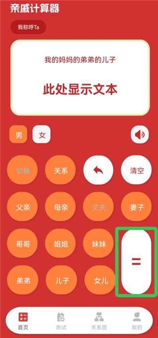 2、之后点击你想要知道的关系,比如我妈妈的弟弟的儿子,再点击【=】号。