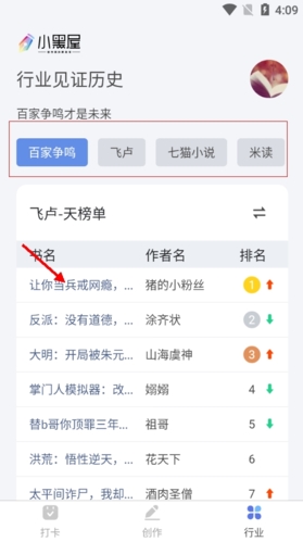 2、进入行业界面,这里包括百家争鸣、飞卢、米读等各大小说阅读平台,在下方包括榜单中的书名和作者名,用户可根据喜欢选择观看别人的作品。