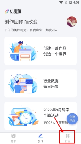 1、打开小黑屋云写作app,进入创作界面后,选择上方的创建板块就可以进入创作流程了,