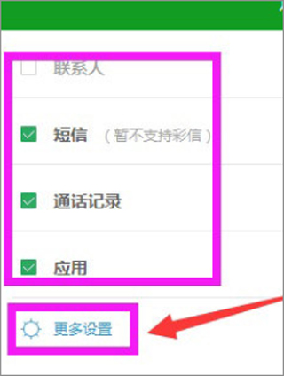 4、这时我们进入手机备份页面,选择你想要备份的内容,然后点击左下角的“更多设置”。