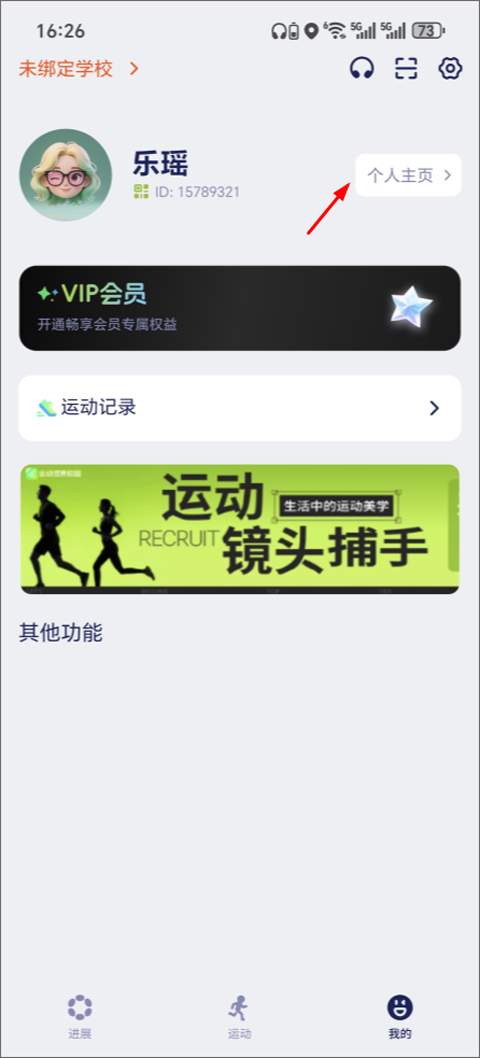 1、打开运动世界校园版,进入后点击右下角“我的”,接着点击左上方“个人主页”;