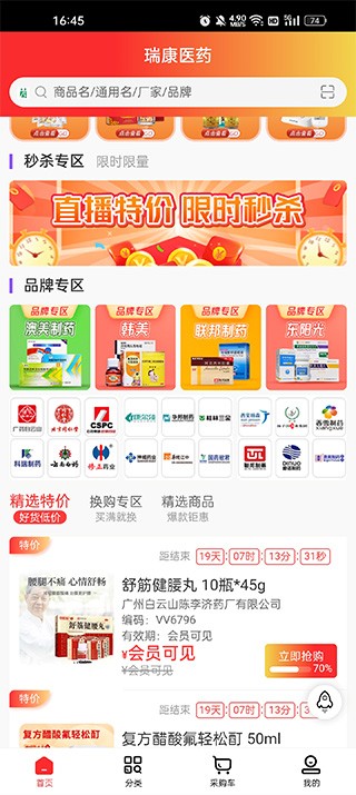 在首页拥有特价秒杀、采购换购、拼团专区、领劵中心等服务;