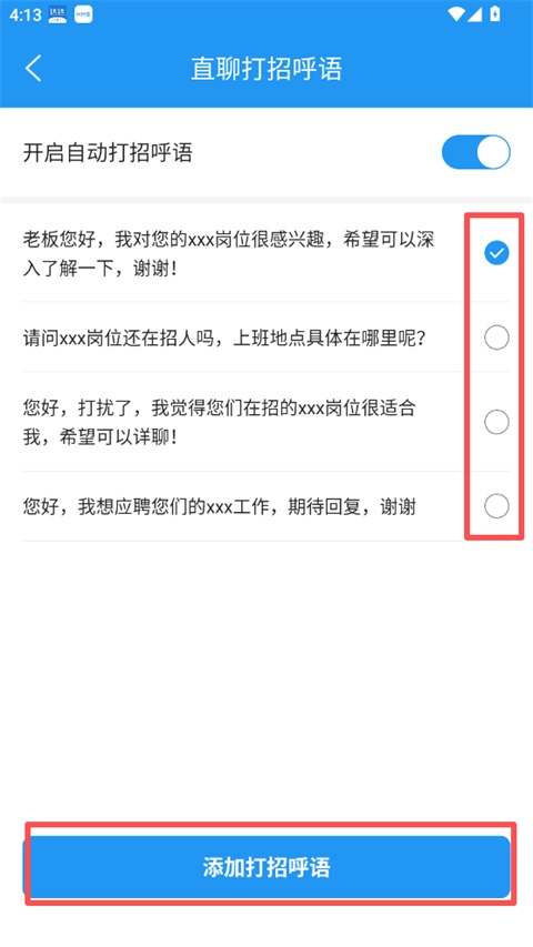 4、可开启/关闭"自动打招呼语"功能;如需自定义话术,可点击"添加打招呼语",创建新的模板。