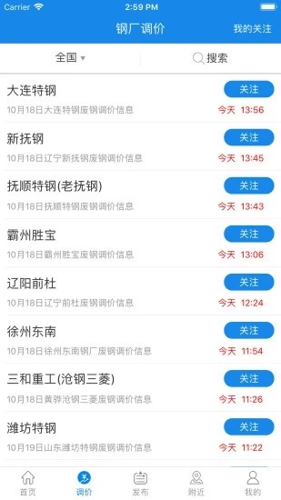 2、钢厂调价信息推送:APP实时更新全国范围内钢厂的调价信息,用户可根据自身需求关注特定钢厂,平台将第一时间推送该钢厂的最新动态,帮助用户及时掌握市场行情,做出明智的交易决策。