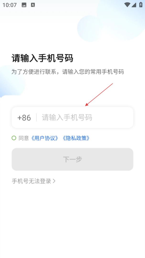 2、在手机号输入页,填常用号码,勾选同意协议,点下一步,若手机号无法登录,可看解决指引。