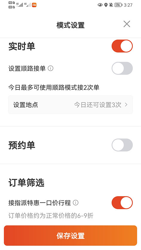 1、模式设置,听单模式选择实时或者全部查看相应的信息,订单范围以及预约时间都能设置。