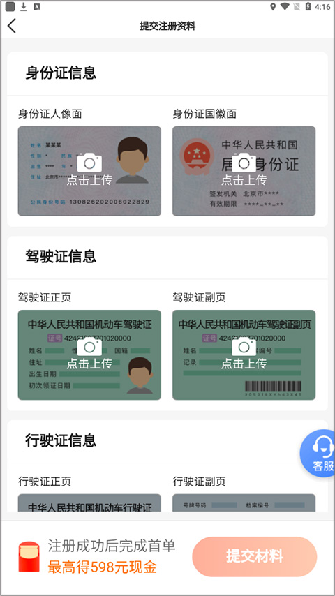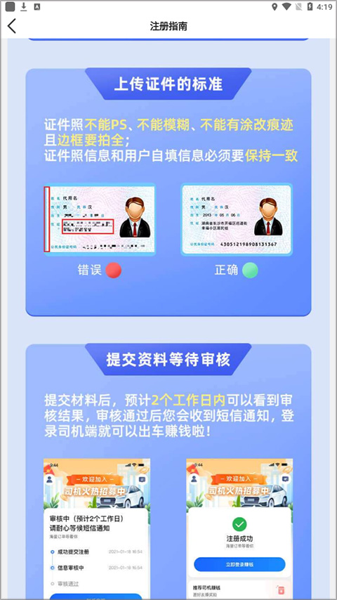 3、注意证件照不能ps、不能模糊、不能有涂改痕迹并且边框要拍全,证件照信息和用户自己填写信息保持一致,提交2个工作日内即可看到审核结果,审核通过即可出车赚钱了。