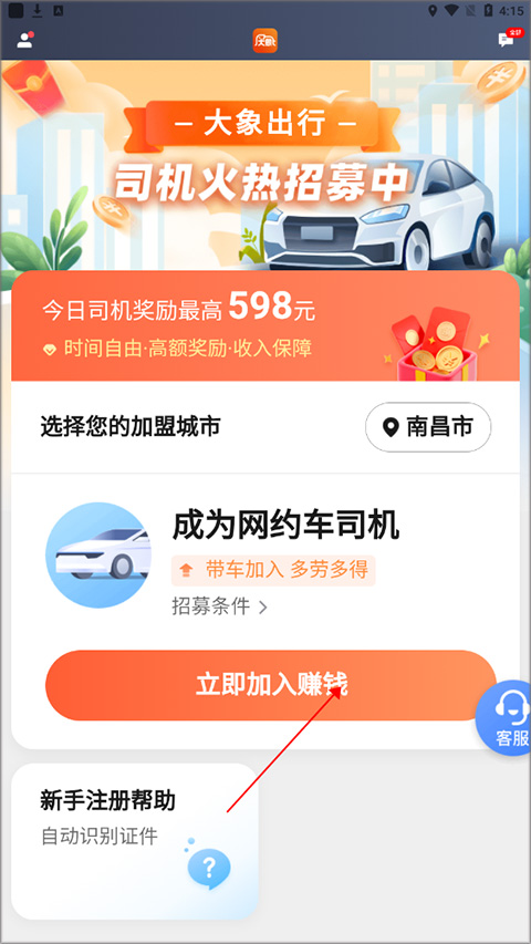 1、下载安装好大象出行司机版,进入软件,点击立即加入赚钱。