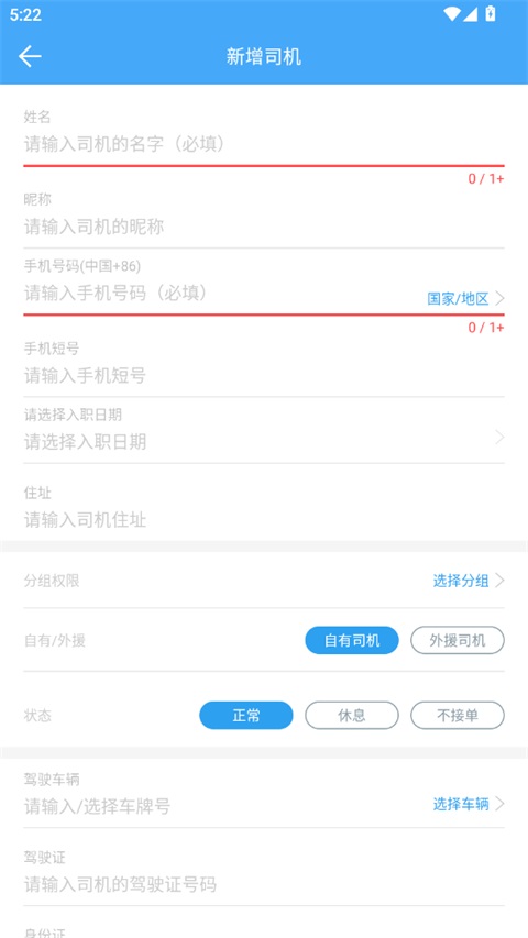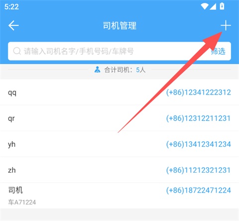 2、在司机管理页面,点击右上角"+"号,进入新增司机填写页面;