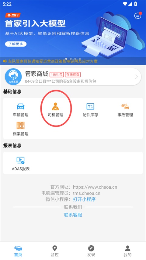 1、打开APP,在首页点击"司机管理",进入司机管理页面;