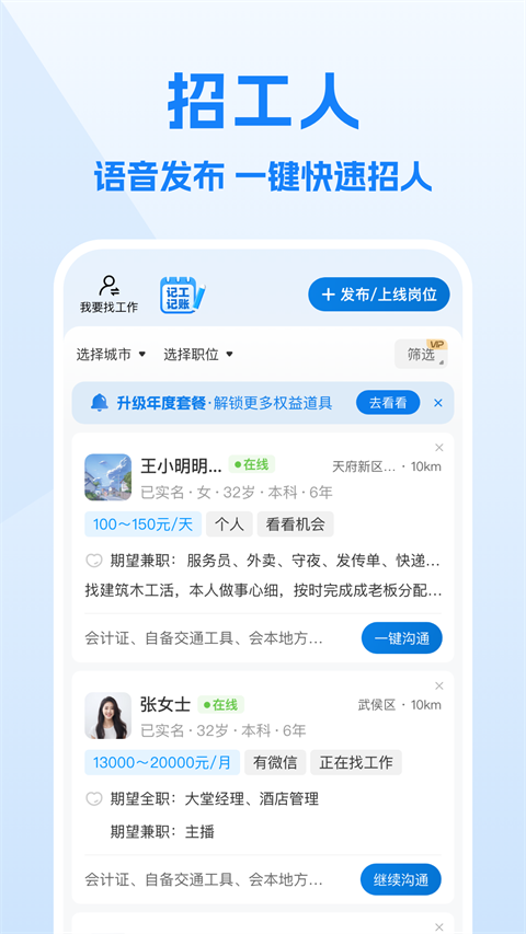 1、在线发布招工信息,能够根据提供的招工信息模板进行编辑,帮助用户便捷发布招工信息。