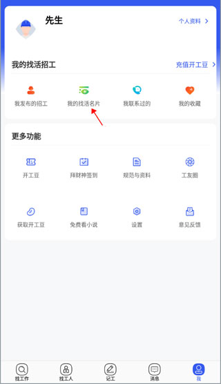 1、打开并登录软件,切换到我的界面,点击功能里面的“我的找活名片”