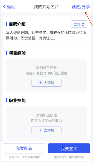 3、设置好之后,可以再次完善自己的个人信息,像项目经验、职业技能等,还可以向朋友分享自己的个人名片