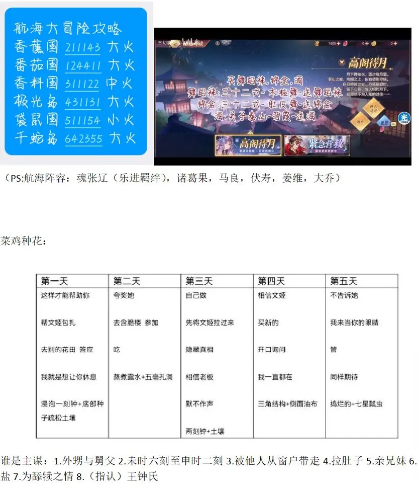 先拿元宝(助阵可以先别开):演武堂冲排名(要求不高,前一百和第一名差距在3000元宝左右,能拿则拿不能摆烂),第一天完成藏馆任务,用掉礼包码,完成家园武将好感度传记(好感度刚好到二级即可,藏馆和好感度完美攻略都在最下面),抽到魂将之后去完成剑心活动,刷分活动不管分高不高打满十次再说(有魂将后完成真的很简单,元宝也很多,然后少女团刷分阵容在文章末尾),福利30级1元宝换888元宝,完成上述内容加上领取部分小活动的元宝之后可以拿到差不多2~3w元宝(探险获取的元宝属于不稳定因素,根据随机开的图鉴的品质不同决定获取多少元宝),可以抽取魂将到一火(总共就花3w元宝,50抽保底,买完抽不到一火纯属运气不行,真的)。